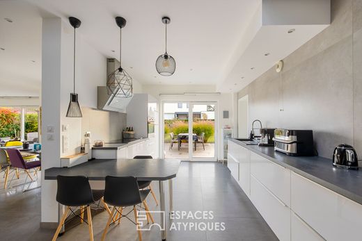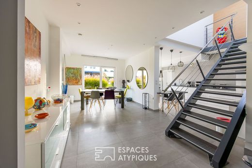 Located 15 minutes from Mulhouse, this contemporary house built in 2012 stands on a 1,260 m² plot and offers 2,830 sq ft of living space. Modern architecture, bright rooms, and high-quality finishes characterize this rare property. Terraces, a wooded garden, a double garage, and an elevator complete the ensemble, providing true comfort of living. The house is distinctly organized around two living spaces. The first, located on the ground floor, is organized around a living room opening onto a bright dining room. The semi-open kitchen, with its adjoining laundry room, promotes fluid and functional circulation. One entire wing of this level is dedicated to the spacious master suite, equipped with a bathroom and a dressing room. An office completes this area. Upstairs, a second suite with a private bathroom has access to a terrace. The second space, also upstairs and accessible by elevator, consists of a living room extended by a large terrace. A kitchen, two bedrooms, and a shower room structure this independent volume, offering great flexibility of use. The exterior features a garden that extends all around the house, allowing for various landscaping options or relaxation areas. The double garage, complete with an outdoor electric charging station, meets current needs. The house is located in a sought-after residential area, a 5-minute drive from shops and schools and a 5-minute walk from public transportation, while maintaining a calm atmosphere. The property's unique character is distinguished by its dual configuration, contemporary architecture with clean lines, and light-filled spaces. The elevator, independent suites, and modular spaces give this property a rare adaptability. A unique property that combines elegance, functionality, and modernity, designed to appeal to buyers looking for a unique place to live. Basel-Mulhouse Airport (EuroAirport) 25 minutes away Basel (Switzerland) 35 minutes away Colmar 35 minutes away ENERGY CLASS: C / CLIMATE CLASS: A Estimated average annual energy costs for standard use, based on average energy prices indexed for 2021, 2022, and 2023 (including subscriptions): between euros3,500 and euros5,000. Contact: Sébastien +33 (0)6 34 67 38 68