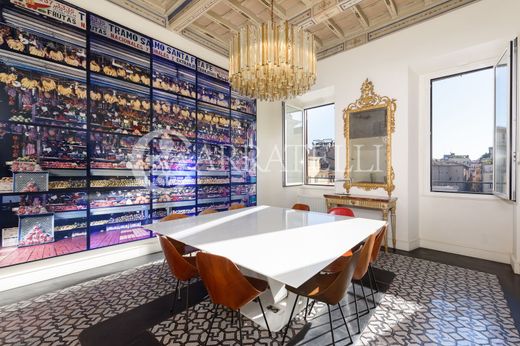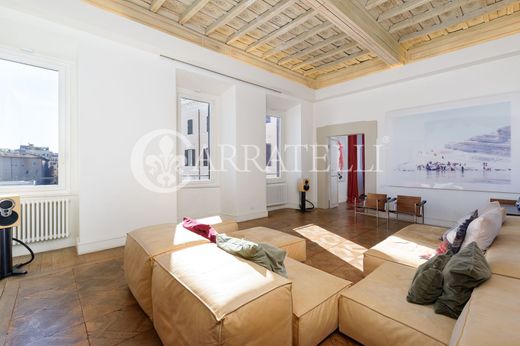 In the most authentic heart of Rome, overlooking Piazza Campo de’ Fiori, a refined and charming apartment in a Renaissance building served by an elevator. An exclusive residence of about 223 sqm with a private terrace of 35 sqm, where history and contemporary comfort meet in perfect harmony. Description Located on the third floor, the apartment stands out for its extraordinary brightness and high ceilings of about 4 meters that amplify the sense of space. The entrance with a corridor leads to a guest room with an en suite bathroom, a dining room, and a large double reception hall with spectacular views of Piazza Campo de’ Fiori and the statue of Giordano Bruno. The living area is completed by an elegant guest bathroom and a spacious eat-in kitchen with a technical/laundry room. The sleeping area hosts a study, an additional lounge, and a master bedroom with an en suite bathroom. Outdoor Spaces From the kitchen, an external staircase leads to the rooftop terrace of about 35 sqm, an authentic private oasis among the roofs of Rome. The space, reserved and quiet, is ideal for entertaining guests or enjoying moments of relaxation while admiring the unique panorama of the eternal city. Finishes and Interventions Renovated with eclectic and refined taste, the residence combines historic elements and Liberty details with high-level modern solutions. Antique majolica floors, patterned parquet, decorated coffered ceilings, and fine materials help create a warm and sophisticated atmosphere. Usability Potential The layout of the rooms and generous sizes make the property perfect as both an elegant main residence and a prestigious representative home or a refined luxury holiday home in the historic center. Location The apartment enjoys a privileged position in one of Rome’s most iconic addresses: Piazza Campo de’ Fiori. A lively and authentic setting, rich in historic shops, restaurants, and historic buildings, just a few steps from Piazza Navona and the Pantheon, the vibrant heart of the Capital.
