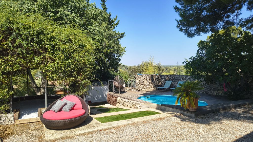 Love at first sight guaranteed for this superb charming house! In a dominant position with a superb view of the Magne Tower, the Corinne Ponce real estate agency offers you this true haven of peace, a completely renovated 120 m2 type 5 house which will seduce you with its authentic character, its beautiful features and its beautiful plot of more than 1,000 m2 with its unobstructed view, its swimming pool and its landscaped garden. We love its various terraces and its Mediterranean atmosphere. The house offers you a living room dining room with a beautiful high ceiling, an office space and library with its skylight. An open equipped kitchen opening onto a large terrace. Two bedrooms including a master suite with its dressing room and its bathroom. Upstairs a bedroom with access to its terrace and a bathroom. We love it!!!