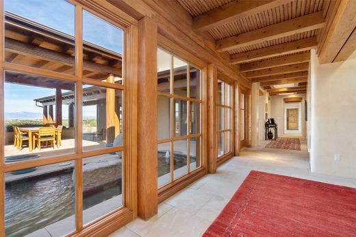Overlooking the 5th hole of the Sunrise Course in coveted Las Campanas, this exceptional residence—with a beautifully appointed stand-alone guesthouse—was thoughtfully sited to embrace the sweeping views that define Santa Fe luxury living. Constructed of Pumice-Crete for enduring quality, the home blends authentic Pueblo architecture with a subtle Eastern influence, creating a timeless aesthetic marked by walls of windows framed in rich wood, graceful flagstone floors, and exquisite ceilings crafted with hand-hewn beams and refined woodwork. Every room feels anchored and intentional, capturing dramatic vistas while maintaining an intimate, welcoming warmth. The grand living room features tall beamed ceilings, a classic fireplace, and wood floors, setting the tone for effortless elegance. The adjacent family room off the well-appointed chef’s kitchen offers another stunning vantage point to the Sangre de Cristo mountains—perfect for relaxed mornings or quiet evenings. The primary suite is a serene sanctuary, complete with its own private courtyard and inspiring views. Two additional spacious ensuite bedrooms and a dedicated office offer ideal flexibility in the main home. The separate guesthouse—with living room and full kitchen—provides exceptional comfort for long-term guests or multigenerational living. Outdoor living here is truly enchanting. A generous portal with fireplace and water feature creates a magical setting for gatherings, all while overlooking some of the finest golf course and mountain views in Santa Fe. Timeless in design and built with uncompromising materials, this remarkable offering stands as a rare haven in Las Campanas—beautiful, enduring, and genuinely unique. A full golf membership is being offered with the sale, and the property can be conveyed nearly turnkey.