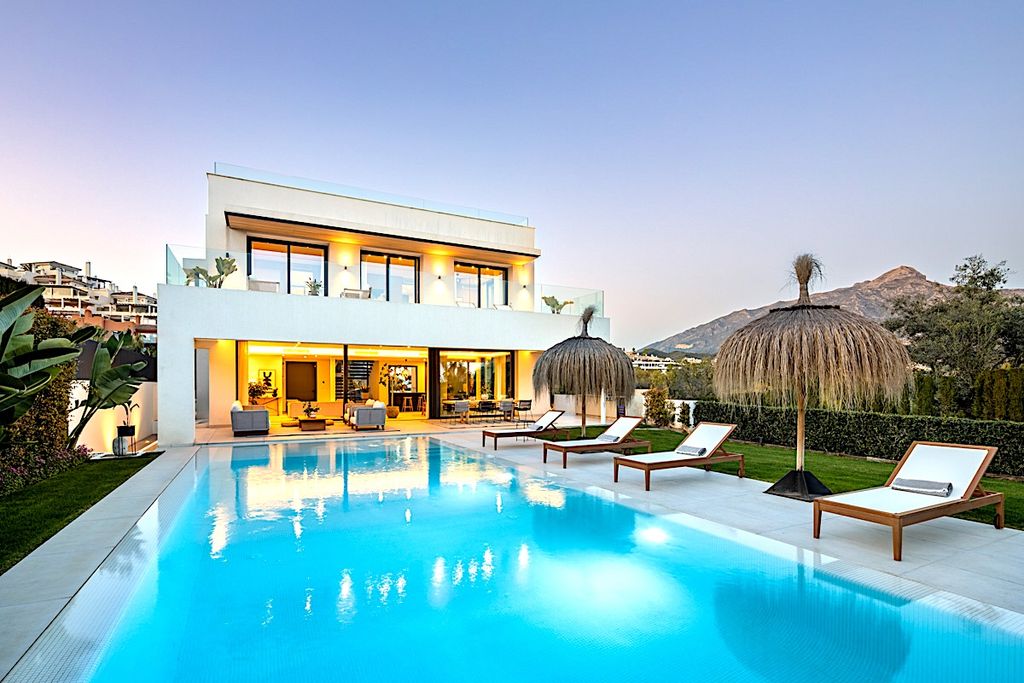 Modern villa in the prime residential area of La Cerquilla, offering an exceptional blend of luxury and convenience. Situated in Marbella’s sought-after Golf Valley, the property enjoys sea and mountain views while being just minutes from all key amenities. The villa’s contemporary design maximises natural light, with floor-to-ceiling glass sliding doors seamlessly connecting the indoor and outdoor living spaces. The open-plan layout enhances both functionality and sophistication, with a sleek modern kitchen featuring a central marble island and state-of-the-art integrated appliances.