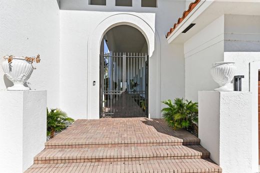 Experience waterfront luxury in this newly renovated direct Intracoastal home. Enjoy breathtaking views from the heated infinity-edge pool and spa, just above your private sandy beach. Inside, soaring 30-foot ceilings, marble floors, quartz countertops, Viking appliances, and designer finishes elevate every space. The grand primary suite features dual walk-in closets, a free-standing tub, and a private patio with panoramic water views. Updates include custom lighting, a quartz fireplace, custom closets, and Gray Malin wallpaper. A guest cottage with a kitchen sits off the gated courtyard. Impact windows, smart home technology, and a security system make it easy to monitor and control your home remotely. Dock your boat on the lift and walk to Old Key Lime House, Eau Resort, or the beach.