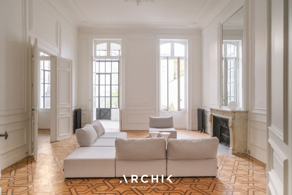 Classic architecture from the late 19th century, this bourgeois building in the Palais de Justice district houses on the garden level a sumptuous 274 m2 duplex where the perfectly restored old elements recall the splendor of yesteryear.