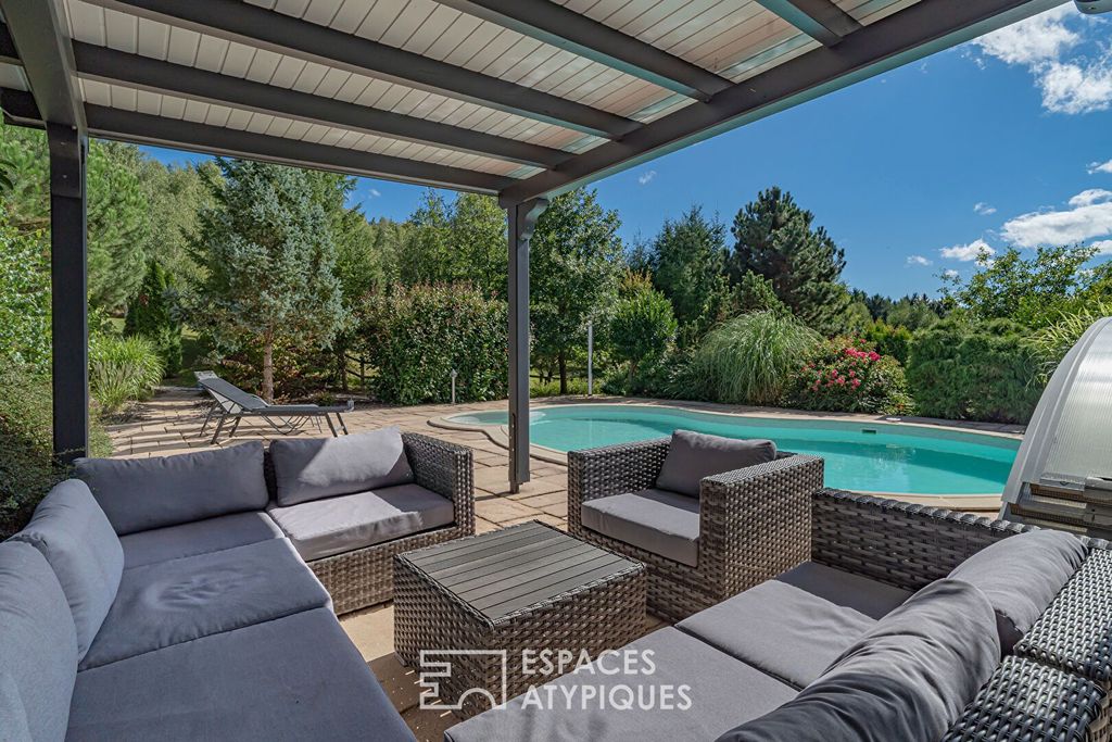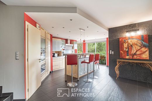 In the heart of unspoiled natural surroundings, 17 minutes from Sarrebourg and 40 minutes from Saverne, lies a 2,630 sq ft architect-designed house on 3.5 acres of landscaped grounds. Built in 2004, this property offers a harmonious living space where comfort meets elegance. Perfectly suited to horse lovers, it charms with its generous spaces, heated indoor pool, terrace, and orchard, creating an environment conducive to serenity and rejuvenation. A landscaped driveway leads to the single-story entrance of the house. As soon as you cross the threshold, your gaze is captivated by a vast living room of over 100 m² bathed in natural light. The interior architecture is distinguished by a cathedral ceiling that gives a feeling of openness and grandeur. The living room, warmed by a wood-burning stove, opens onto a German-quality fitted kitchen. This welcoming reception area extends naturally onto the terrace and pool. An office, located on a suspended mezzanine, offers breathtaking views of the surrounding greenery. The property has three bedrooms, including a master suite with a dressing room, bathroom, and private balcony. One bedroom has its own shower room, and a third bedroom also has its own dedicated shower room. To complete the functionality of this home, there is also a laundry room, a cellar, and a double garage accessible from the entrance. The exterior of the property is a true haven of peace and a unique asset. The estate is a paradise for horse lovers, with Rinco Carlo equestrian facilities, including a stable, an arena, and a lunging ring. The stable roof is equipped with a 17kW photovoltaic installation generating an annual income of euros1,600. The proximity of Sarrebourg and Saverne offers quick access to all amenities, schools, and shops, while benefiting from the tranquility of life on the edge of the forest. This architect-designed house is a rare and unique property on the real estate market. Its spaciousness, the quality of its materials, its contemporary architecture and its equestrian facilities make it a dream property for buyers looking for a place to live that combines comfort, modernity and respect for nature. Double garage 4 parking spaces Cellar Shops 5 minutes away by car Train station 15 minutes away by car Nursery school 5 minutes away by car Primary school 14 minutes away by car Middle school 12 minutes away by car ENERGY CLASS: C / CLIMATE CLASS: C Estimated average annual energy costs for standard use, based on average energy prices indexed for 2021, 2022, and 2023 (including subscriptions): between euros2,780 and euros3,820. Contact: Kévin 06.95.36.00.99