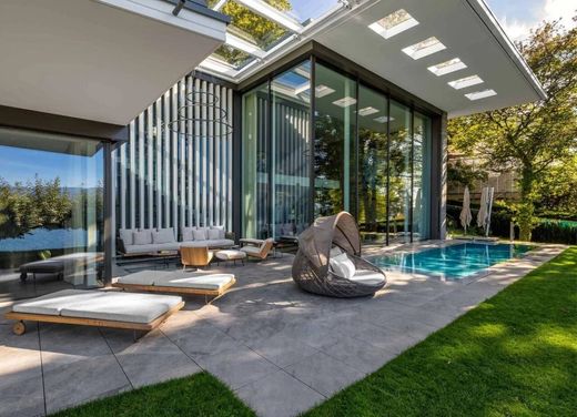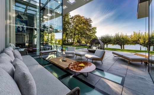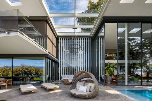 This exceptional property, located on the shores of the commune of Anières, is a contemporary waterfront villa built on a 3,000 m² plot with private lake access. It features a lake house with private pontoon, two mooring buoys and a boathouse. The architecture, designed by a renowned architect, combines spacious volumes with abundant natural light. Spread over two levels and a basement, the villa offers almost 1,000 m² of living space, with 14 rooms oriented east-west for optimal sunlight. Interior features include a spa area with swimming pool, gym, cinema room, massage room and a seven-car garage with elevator. This property harmoniously combines luxury, comfort and connection with nature, offering an exceptional living environment. Parce que chaque client mérite un royaume