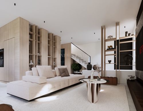 Built across three floors plus a rooftop terrace, the villa’s layout has been carefully planned to provide effortless flow and functionality. The ground floor features a bright open-plan living and dining area that opens directly to the pool terrace and garden. The fully fitted kitchen combines minimalist design with warm finishes, featuring high quality MDF cabinetry, high-end integrated appliances and a convenient pantry. Ceramic tile flooring throughout the main living areas enhances the contemporary aesthetic, offering a seamless, durable and elegant surface ideal for modern living.