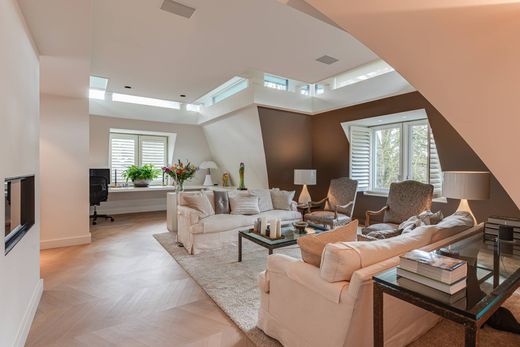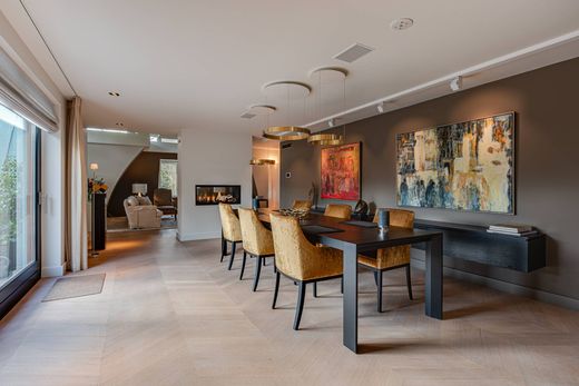 Located on Prinses Beatrixlaan in the centrally situated town of Baarn, this exceptionally elegant, modern, and luxurious penthouse occupies the third (and top) floor in one of the area's most desirable locations. Offering 272 m² of living space, it features two terraces (for morning and afternoon sun), two private parking spaces, and a storage room within a secured, private section of the underground garage. This private area is enclosed by a remotely operated rolling door and also includes a private fitness room with the potential for a shower, sauna, or jetstream system. Additional parking is available in the beautifully landscaped communal garden. This beautifully designed and meticulously finished penthouse reflects refined taste and an uncompromising commitment to premium materials and top-quality fixtures. Located within a protected village view zone, built in 2005, energy label A. The interior was completed in 2017, and the current owners are the first residents. The small-scale apartment building *Residentie Beatrijs* is equipped with an elevator and houses just seven villa-style apartments. Designed by architect Jan Griffioen, the building combines contemporary architecture with the charm of classic Baarn villas. It is surrounded by a professionally landscaped park garden featuring mature trees, flower beds, walking paths, rolling lawns, and even a tea house. The penthouse occupies the entire top floor. Upon entry, one is immediately struck by the continuous band of windows just below ceiling level, which floods the space with natural light and creates a unique, open atmosphere. The abundant daylight and the high-quality finishes — including oak and marble floors with underfloor heating — lend the penthouse a distinguished allure. Further luxuries include an advanced home automation system, air conditioning, a comprehensive security installation, and excellent sound insulation through double cavity walls and floating floors. Live comfortably, sustainably, and securely in one of the finest apartments in the Gooi region — with optimal privacy and just 30/20/10 minutes from Amsterdam, Utrecht, and Amersfoort. Layout Private, secure elevator access opens into a spacious reception hall with a cloakroom and a hallway featuring a built-in library wall. Double doors lead to the generous living area, visually divided into a lounge, dining room, and breakfast room — all seamlessly connected with an open and transparent flow. A two-sided gas fireplace separates the lounge and dining areas, while a room divider defines the breakfast space. From the dining room, a hardwood sliding door provides access to the covered terrace (afternoon sun). A second two-sided gas fireplace connects the kitchen and breakfast room. The breakfast room opens to the spacious open-plan kitchen/dining area, which also has access to a second large terrace (morning sun) via another hardwood sliding door. Adjacent to the living area are two separate home offices, each fitted with custom-built desks and storage drawers. The modern, fully equipped Miele kitchen includes a built-in cabinetry wall, an island, integrated appliances, and a hidden television built into the glass backsplash behind the counter. From the hallway, you access the guest toilet with wall-mounted WC and washbasin. The spacious primary bedroom features a walk-in closet and a large en-suite bathroom finished in light marble, with a walk-in shower, designer bathtub, double sink vanity, and wall-mounted toilet. The second spacious bedroom also has a private en-suite bathroom, similarly finished in light marble and equipped with a walk-in shower, sink vanity, and wall-mounted toilet. This bedroom flows into an additional room suitable for use as a study, hobby room, or guest room. Additional features - Video intercom and alarm system at entrance - Pets are not permitted in accordance with the regulations of the apartment building. - Monthly service costs: € 1,296