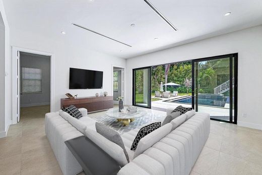 Built in 2023 and located on treelined intracoastal block in SOSO. Mediterranean inspired residence offers 4BR/4.5BA in the main house with high ceilings, open-concept living, and media room. Chef kitchen features built-in Thermador appliances, built in pantries, and custom closets throughout. The primary suite includes a private balcony. Separate guest studio with a full bath that offers fixable space for visitors, a home office or extended stays. Includes one car garage. Enjoy outdoor large lounging area pool, and hot tub in a private gated backyard. A true turn key oasis in an exceptional location.