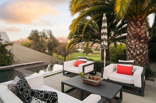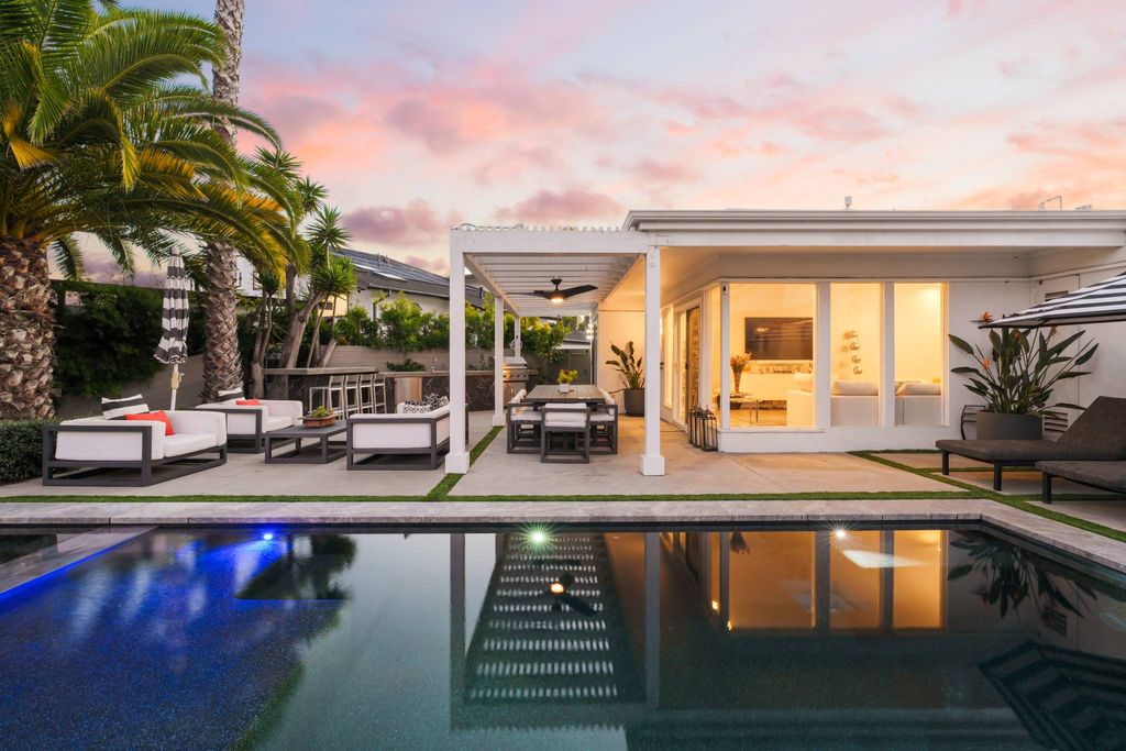 Front-row on the iconic Champions Course at Omni La Costa, this striking single-story estate is set on a premier lot overlooking the 3rd hole. Spanning 3,720 square feet with 5 bedrooms and 3.5 bathrooms, the home offers a resort-style backyard with a brand-new infinity-edge pool and spa, plus a fully equipped outdoor kitchen. Expansive golf course and hillside views provide a stunning backdrop, while the open living and kitchen areas flow seamlessly to the outdoors, creating truly effortless indoor-outdoor living. A stunning glass atrium floods the home with natural light, emphasizing mid-century modern elegance and relaxed coastal style. Highlights include soaring columns, expansive walls of glass, 14-foot leaded entry doors, a private interior courtyard, and solar. Steeped in history and rumored to have hosted Old Hollywood legends including the Rat Pack, Lucille Ball, and Clint Eastwood, the home blends timeless charm with modern luxury. The chef's kitchen, featuring quartz countertops, white shaker cabinetry, stainless steel appliances, and wine storage, opens to the open living space with sweeping golf course views, a custom bar, and fireplace - making this a truly special home in one of La Costa's most sought-after neighborhoods.