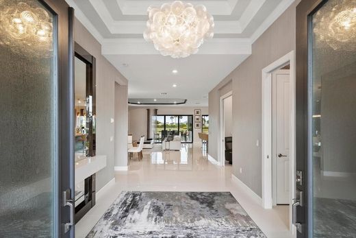 This Pallazio floor plan features extensive post-construction upgrades that go far beyond builder offerings. Offering 3 bedrooms, 3 bathrooms, plus a study/flex space, this exceptional home is situated on a quiet cul-de-sac on an oversized .36-acre pie-shaped lot that widens at the rear and overlooks a serene lake. Structural enhancements include an extended covered lanai, extended gourmet kitchen, outdoor kitchen gas and plumbing rough-ins, and extended bay windows in the primary suite. All impact windows and doors, paired with a brand-new barrel tile roof (2023), provide peace of mind and contribute to lower homeowners insurance rates. Inside, oversized porcelain tile flooring throughout (no carpet) creates a light, airy, and cohesive aesthetic. Professionally designed interiors take take this home to the next level with elevated finishes and thoughtful details throughout. The upgraded extended gourmet kitchen is an entertainer's dream, featuring all Thermador appliances, including a built-in refrigerator and wine fridge. A Thermador gas cooktop with griddle, paired with a custom range hood and built-in wall ovens, adds both function and style. The true showstopper is the 3-inch mitered porcelain countertops, a premium feature not offered by the builder, anchored by a striking waterfall island. The living room showcases a custom acrylic wood-finish built-in with integrated lighting. Pocket sliding glass doors seamlessly blend indoor and outdoor living, opening to lake views and an extended lanai equipped with motorized roll-down screens on all three openings, controlled at the touch of a button. The primary suite is nothing short of spectacular, enhanced by the bay window extension that floods the space with natural light and creates a private sitting area. The spa-like primary bath features dual shower heads, and the custom-designed walk-in closet is truly ready for your Chanel. This home offers a rare combination of design, upgrades, location, and lifestyle. A must-see for buyers seeking refined luxury and effortless indoor/outdoor living.