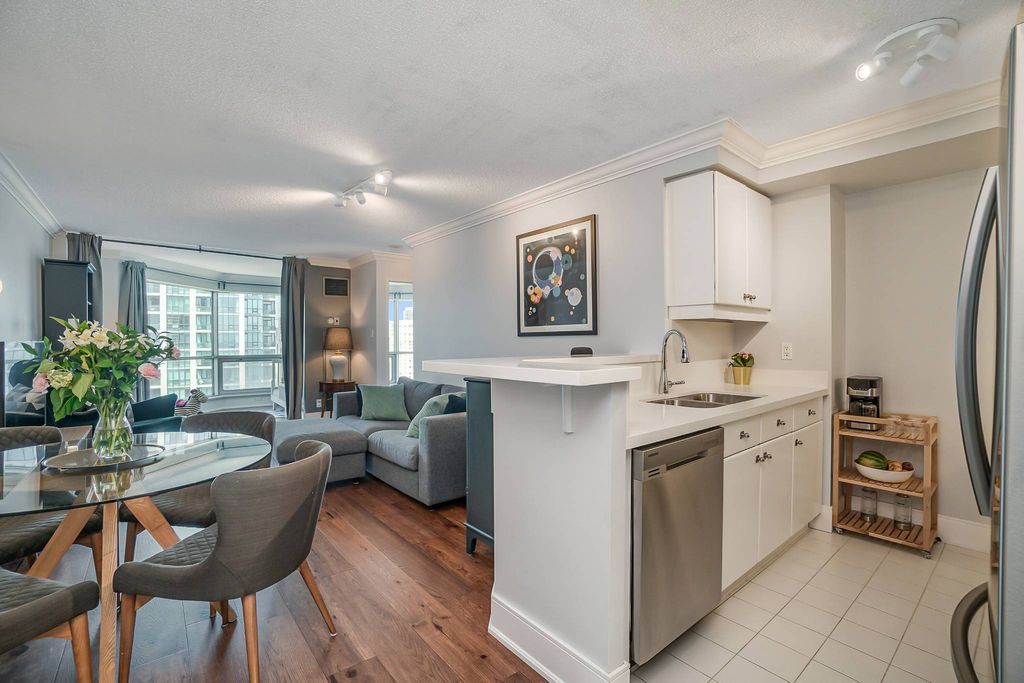 Welcome to the Residences of the World Trade Centre. This stunning one bedroom plus den condominium features recently upgraded engineered wood floors, a renovated kitchen with quartz countertops, newer appliances, a four piece washroom, and a large solarium. Outstanding amenities include the sky lounge with a full-sized gym, recreation room, both indoor and outdoor pools, a rooftop patio, twenty-four hour concierge service, and visitor parking. One parking space is included.