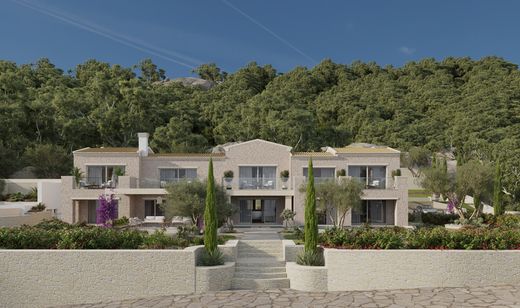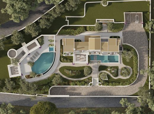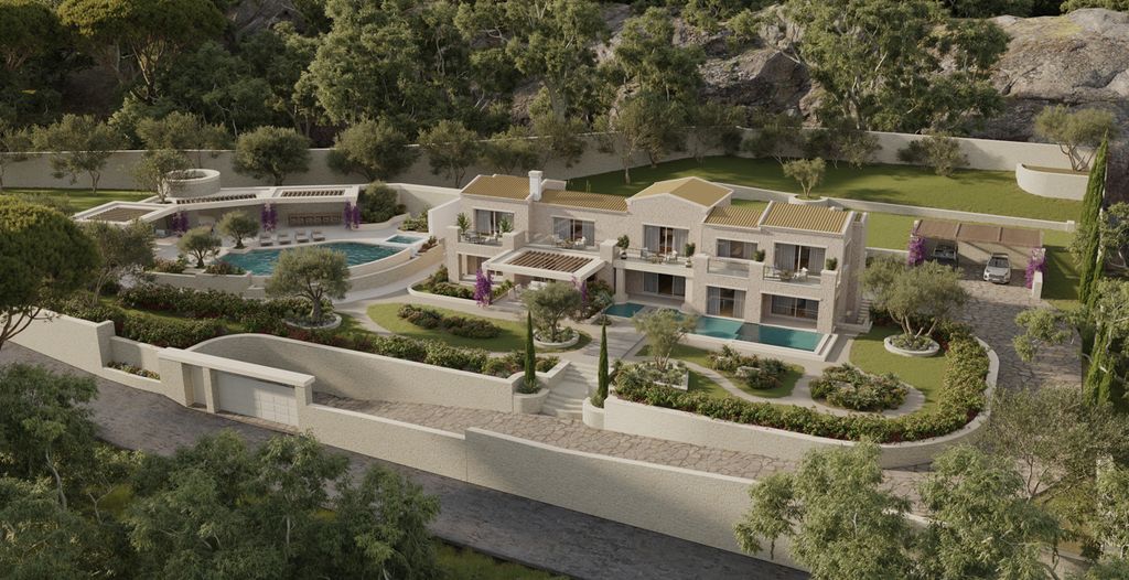 The surrounding grounds are designed to feature landscaped gardens, two swimming pools, a dedicated BBQ and outdoor dining area, and generous terraces positioned to enjoy sunset views over the Ionian Sea.