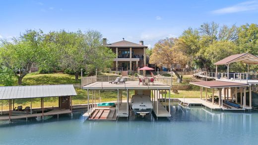 Absolutely gorgeous lake house on stunning Lake LBJ! Serene setting in a beautiful quite cove, 57' feet of fantastic waterfront situated on a quarter-acre lot with large oak trees, truly a wonderful setting. If you have been looking for a quality-built lake house priced to sell, this is it! Custom-built home, featuring 5 bedrooms and 5 full baths, a large open concept living room with a wonderful stone fireplace, chefs kitchen with custom cabinetry, a gas cooktop, a breakfast bar, and granite countertops. Downstairs is an additional media game room. Upper and lower level patio areas, all with great entertaining space and views of Lake LBJ. This quiet cove provides for wonderful water sports, fishing, swimming, paddle boarding, kayaking, sunning, or feeding the ducks. The boathouse is a single-stall boat lift with an electric lift and 2 jet ski lifts, allowing for 4 jet skis. Large deck // entertaining area abovethe boat house. Come have a look at this Lake LBJ Beauty! Life is short! Buy the Lake House!