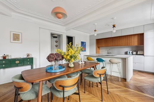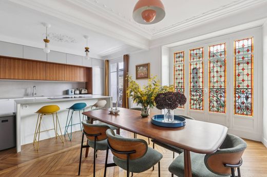 Located on the 4th floor with elevator of an elegant period building, this charming apartment in perfect condition enjoys a highly sought-after location in the heart of the Jules Joffrin neighborhood, in immediate proximity to shops, public transport and the town hall of Paris’s 18th arrondissement. From the moment you enter, the apartment impresses with the quality of its finishes, its well-balanced volumes and its abundant natural light. It is centered around a bright, through double living room, benefiting from a west-facing exposure and offering an open, characterful view of the Notre-Dame de Clignancourt church. The open-plan kitchen, fully fitted and equipped, blends seamlessly into the reception area and naturally extends the living space, making it ideal for entertaining. Each of the two bedrooms features its own en-suite bathroom with private WC, as well as an adjoining walk-in closet, ensuring optimal comfort and generous storage space. This layout provides complete privacy for each sleeping area. A cellar completes the property. The apartment has retained all the charm of period architecture, enhanced by high-quality features: solid herringbone parquet flooring, fireplace, elegant moldings, and beautiful stained-glass windows in the living room and one of the bedrooms, creating a warm and distinctive atmosphere. Perfectly served by Jules Joffrin metro station (Line 12) and Simplon (Line 4) just steps away, the apartment benefits from a lively and desirable environment, rich in restaurants, specialty food shops, cafés and cultural venues. Montmartre and the Sacré-Cœur are within a 15-minute walk, offering an iconic Parisian lifestyle. A rare property combining location, elegance and Parisian art de vivre, designed for a discerning clientele.