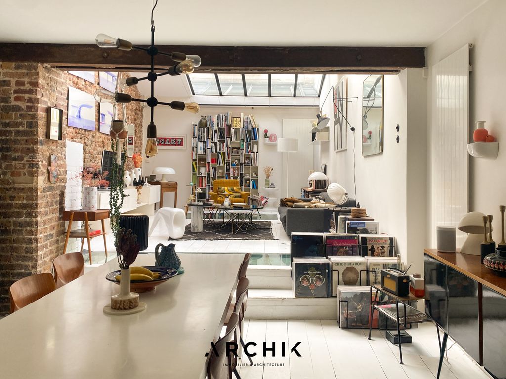 A piece of 20th-century industrial architecture, this former furniture factory, tucked away at the end of a cobbled courtyard typical of the artisanal past of the Charonne-Keller neighborhood, is home to a characterful 1,765-square-foot loft studio for mixed use, ideal for a freelance professional, reinvented as a living space, like a detached house, just a stone's throw from Rue Keller.