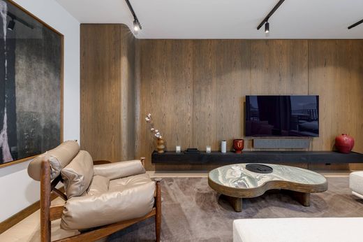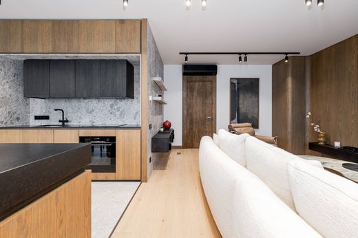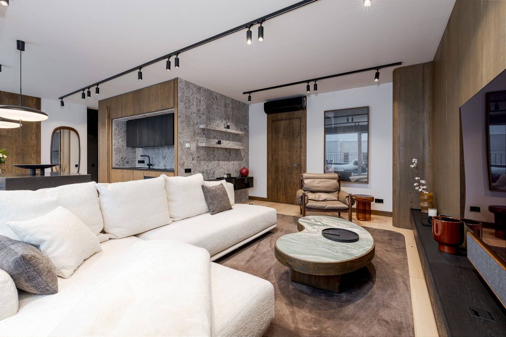 A modern apartment for sale at Rūpniecības Street 27, located in a quiet inner courtyard on the 6th floor of the building. The layout is designed for comfortable everyday living and elegant lifestyle, emphasizing light, functionality, and high-quality materials. Upon entering the hallway, there is a built-in wardrobe with thoughtfully designed sections for outerwear, shoes, and household items. To the left is a guest bathroom with a shower, also featuring a built-in cabinet with a washing machine. The spacious living room is seamlessly combined with the kitchen and dining area; the interior includes high-quality designer furniture, while panoramic windows allow plenty of natural light. All rooms are fitted with blackout blinds and curtains to ensure privacy and comfort even on sunny days; the central blind is remote-controlled. The kitchen is fully equipped with Bosch built-in appliances — oven, cooktop, extractor hood, and built-in refrigerator. The apartment has two bedrooms; the master bedroom features an en-suite bathroom with a bathtub. Both bedrooms are fully furnished and include built-in wardrobes. The terrace runs along the living room, kitchen, and one of the bedrooms, furnished with high-quality outdoor furniture — an ideal space for relaxing mornings or evening conversations. The property includes 2 underground parking spaces. Individual utility meters, air conditioner and recuperation system are installed, and the building has an elevator. This apartment is ideal for discerning buyers who value comfort, design, and tranquility in the city center. Contact us for more information or to arrange a private viewing.