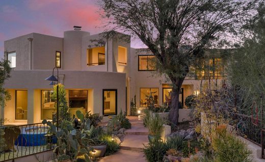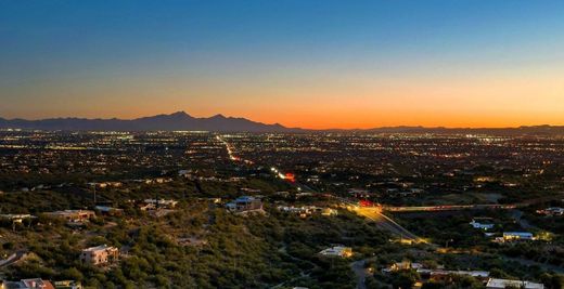 Perched atop a ridgetop in Cimarron Foothills Estates, this exceptional Catalina Foothills residence commands some of the most spectacular views in Tucson, showcasing sweeping city lights and multiple surrounding mountain ranges. A cascading architectural fountain welcomes guests at the front entry, setting the tone for the refined experience that unfolds throughout the home. Travertine floors flow throughout light-filled living spaces, where thoughtful design balances comfort and sophistication. The expansive upstairs family room opens directly to a panoramic view deck, seamlessly extending the living space outdoors and creating an ideal setting for both intimate evenings and large-scale entertaining. Downstairs, a cozy living area is anchored by a rock-faced fireplace, (continued) offering a warm and inviting retreat perfect for relaxed gatherings or quiet moments. The dining room has a dramatic 2-story ceiling height and overlooks the walls of sliding glass doors looking onto the city view. The recently renovated kitchen is a true centerpiece, designed for the serious cook with high-end appliance appointments, dual islands, and an adjacent bar area. A third oven and a second refrigerator located in the three-car garage support effortless large-scale entertaining. Multiple patios provide a variety of settings for gatherings, complemented by a large PebbleTec pool overlooking the city lights, a long covered patio with adjacent outdoor fireplace seating, and a private spa nestled within serene northeast-facing gardens. The terraced north yard offers multiple seating areas framed by outstanding mountain views. Two primary suites provide exceptional