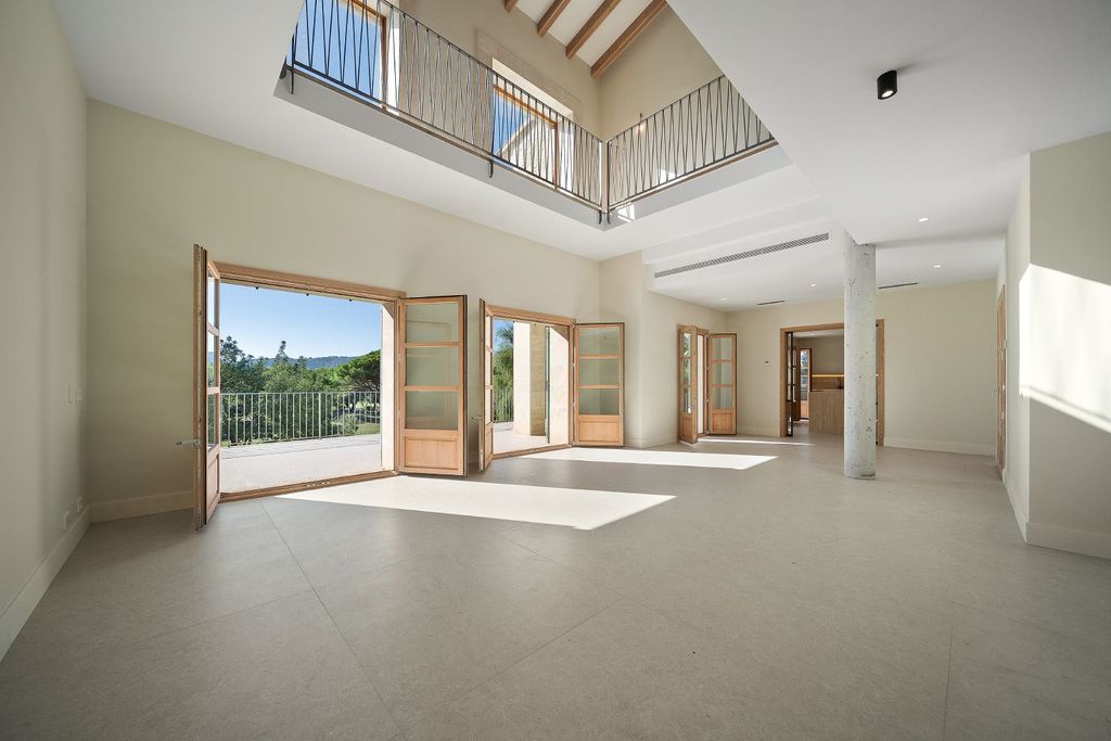 This elegant newly built villa is located in the elevated area of the Pollensa Golf and offers 455 m2 built over 2 floors with pool, garage and approx. 150 m2 of terraces, on a plot of approx. 1.430 m2. The villa is laid out on a ground floor with a spectacular two-level open living room, kitchen with Travertine marble island and wine fridge, bedroom with dressing room and en-suite bathroom, plus laundry room, guest toilet, library and the large terrace with 43 m2 pool. On the 1st floor there are 3 more complete bedrooms, each with its own walk-in closet and en-suite bathroom, as well as a garage for 1 vehicle. The luxury qualities include wooden windows, stone façade, microcement in bathrooms, centralized air conditioning, ceramic and parquet flooring and luxury finishes.