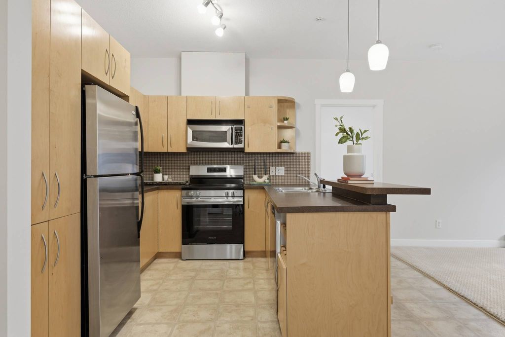 Welcome to this bright and spacious 2 bedroom, 2 bathroom ground-floor unit in an unbeatable location. Offering 816 square feet of well-designed living space, and nearly 9 ft ceilings, the home features a smart split-bedroom layout—placing bedrooms on opposite sides of the unit for privacy, making it perfect for roommates, guests, or families. Step directly onto your private patio with a gas hookup, overlooking lush green space and a walking path—an ideal setup for dog owners or anyone who appreciates easy outdoor access. Inside, the home is truly move-in ready featuring professionally-installed, brand new shower fixtures, a fresh coat of paint throughout and brand-new stainless steel dishwasher and electric range. The sun-filled living area with a cozy gas fireplace is designed for entertaining with a dedicated dining area and a breakfast bar for casual meals with friends and family. You are well positioned just steps from the Westside Recreation Centre, home to swimming pools, skating rinks, a fitness centre, and an indoor track. The location is incredibly walkable, situated near 69th St LRT Station for an easy commute, Ernest Manning High School, Ambrose College and Springborough Professional Centre featuring local favourites like Waves Coffee, an award-winning yoga studio, and diverse dining options. Rounding out this exceptional package is a heated underground parking stall conveniently located near the elevator, along with a separate storage locker, bicycle storage, access to an underground car wash, and ample visitor parking.