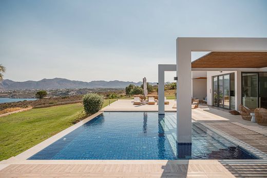 Three generously sized bedrooms on this level offer en-suite bathrooms, private terraces, and views that stretch across the bay. On the lower floor, two additional guest suites ensure privacy and flexibility, while the surrounding outdoor spaces provide a peaceful retreat: landscaped gardens, shaded pergolas, a summer kitchen with BBQ, and a courtyard infused with authentic Cretan charm.