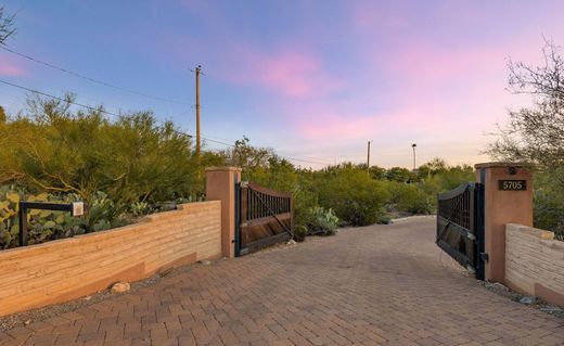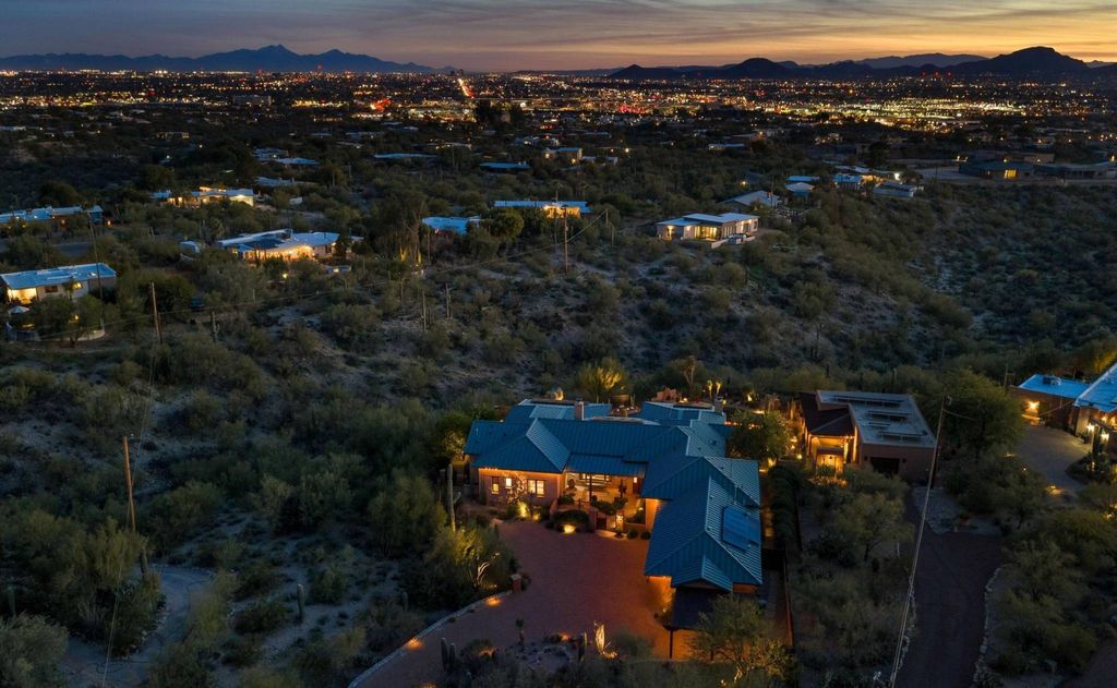 Set on 3.41 acres of pristine Sonoran Desert hillside, this exceptional cement-stabilized mud-adobe estate offers sweeping city lights, mountain, and sunset views with timeless Southwestern architecture and modern luxury throughout. The 3-bedroom, 3-bath main residence is complemented by a private 1-bedroom, 1-bath guest casita with full kitchen--ideal for guests, multigenerational living, or a private studio.Built in 2007, the main home showcases exposed wood beam ceilings, painted interior adobe brick walls, polished concrete floors, 8' alder doors, custom wood columns, and two authentic beehive fireplaces with designer tile accents. A warm, cohesive palette blends natural wood, earth tones, and soft plaster finishes. Thoughtful upgrades include custom Roman shades, an office with built-in cabinetry, a spacious laundry with extra refrigeration, tankless gas water heaters, whole-house water softener, interior/exterior fire sprinklers, and zoned Trane HVAC with gas heat (replaced 2023). The chef's kitchen was fully renovated in 2024 by acclaimed Tucson designer Marina Luz of LCM Interiors and features custom walnut cabinetry, honed quartzite countertops, designer tile backsplash, plastered range hood, oversized 9' island, walk-in pantry, Sub-Zero refrigeration, Wolf 6-burner gas range, built-in Thermador oven and microwave, wine refrigerator, and built-in ice maker. The kitchen opens seamlessly to dining and living areas anchored by the second fireplace. The detached guest casita (approx. 800 sq ft, built 2013) offers complete privacy with its own driveway and one-car garage. It includes an open living/dining area, full kitchen, polished concrete floors, recessed lighting, ceiling fan, laundry, storage, and a private outdoor shower enclosed by stucco walls with city views. Outdoor living is equally impressive with covered patios, wood beam detailing, a cantera stone fountain courtyard entry, outdoor beehive fireplace, stainless steel BBQ, synthetic turf installed 1/2026, and resort-style pool re-plastered in 2023 with new tile and warranty. Additional highlights include owned solar (44 panels) with upgraded 400 AMP service, raised-seam metal roof, gated entry, paver driveway, mature citrus, low-care irrigation, twilight landscape lighting, Ring cameras, oversized 3-car garage at the main house plus casita garage, and select furnishings available via separate bill of sale. A rare offering blending authentic adobe craftsmanship, privacy, views, and refined desert living.