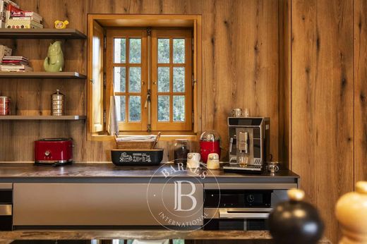 Upstairs, three suites each benefit from a shower room and a dressing area. A mezzanine overlooking the living room offers a versatile space opening onto a terrace with mountain views.