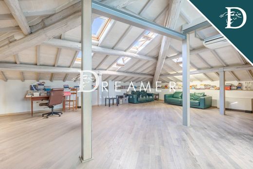 The property, dating back to the early 1900s, opens on the ground floor with an elegant entrance hall, a double living room, a dining room, an eat-in kitchen with access to balconies overlooking the garden, and a guest bathroom. The first floor features four bright bedrooms, including a master bedroom with a walk-in closet and three additional double bedrooms, one with a private balcony. Two bathrooms, one with a shower and one with a bathtub, complete the floor. The top floor is an open-plan attic space ideal as a loft, reading room, or home theater.