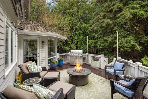 Located in the coveted Tuscany community of Woodinville, this nearly 5,000-square-foot, five-bedroom, three-and-a-half-bath home offers exceptional scale, privacy, and flexibility. Set on a cul-de-sac and backing to a greenbelt, the property features a private deck with hot tub and a tranquil, wooded backdrop. The formal living room showcases soaring ceilings and expansive windows that flood the space with natural light, while formal and informal dining areas connect seamlessly to outdoor living. The kitchen is designed for function with updated appliances, large pantry storage, and beverage fridge. Multiple bonus spaces support home offices, fitness, or study. The lower level includes a media room with backyard access and flexible living areas offering potential for a private mother-in-law suite or rental conversion, subject to buyer verification. Ample storage, generator wiring, air conditioning, an oversized 3-car garage, and access to nearby walking and equestrian trails.