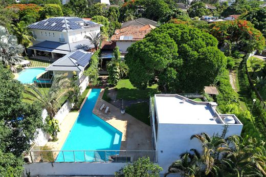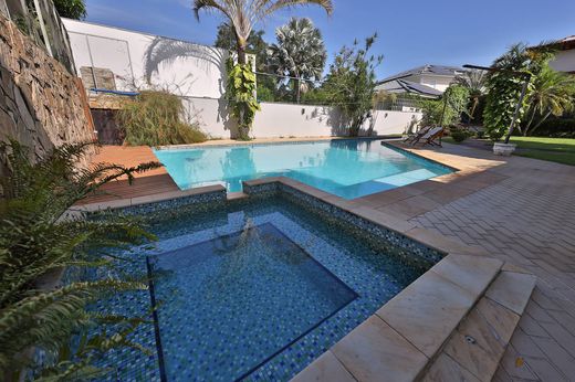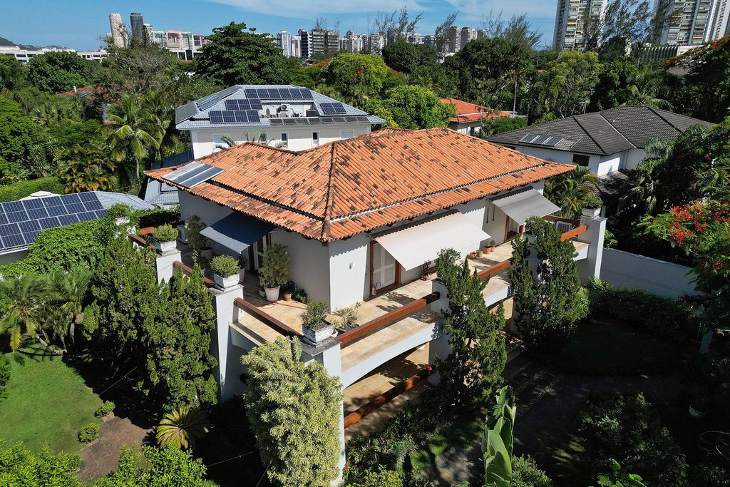 This duplex house is located within a residential gated community in Barra da Tijuca and offers approximately 8,763 sq. ft. of built area, distributed across two levels with a spacious and well-organized floor plan. The social area includes a living space arranged into multiple environments, such as living rooms, dining area, and TV room, as well as a powder room and wine cellar, with layouts that support integration and circulation. The breakfast room and fully equipped kitchen are well proportioned and connect to the service area with full staff quarters. The private area features four well-distributed en-suite bedrooms. Outdoor leisure areas include a garden, swimming pool, sauna, and a gourmet space with barbecue facilities, forming a functional setting for everyday use and social gatherings. The property offers four parking spaces. The condominium provides twenty-four-hour doorman service and security, ensuring controlled access and organized common areas.