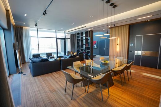 This penthouse offers a premium urban living experience defined by generous proportions, high-end finishes, and a strong sense of privacy, all arranged on a single level across nearly 300 square meters of interior space. The property was fully renovated in 2025 and is delivered turnkey. Access is provided via a private elevator opening directly into the residence. The living area is spacious and well-proportioned and includes a functional fireplace, with large glazed surfaces connecting the interior to the surrounding terraces. All principal rooms benefit from natural light and direct exterior exposure. The kitchen and technical areas are equipped with Miele appliances, while the audio and video systems are by Bang & Olufsen. The interiors are furnished with premium pieces integrated coherently into the overall design. The property also includes a dedicated wine storage area. The layout allows flexibility depending on lifestyle needs: the gym area, with exterior views, can be converted into a fourth bedroom. The entire penthouse has direct access to large terraces, with open views from every main living space. The location is among the most sought-after in Bucharest, offering walking access to green areas and natural surroundings, while maintaining convenient connectivity to the city.