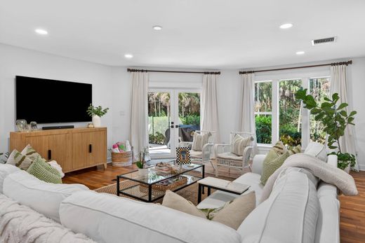 Designed for indoor-outdoor living, the home opens to a resort-style swimming pool with expansive patio areas complete with a travertine pool deck, perfect for entertaining or relaxing in complete privacy. Outdoor living spaces provide opportunities to enjoy Florida's year-round sunshine, whether hosting gatherings or savoring quiet mornings surrounded by nature.