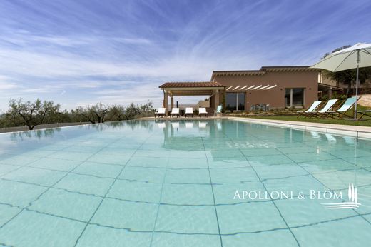 An enchanting setting amidst the Val di Chiana, this contemporary villa in energy class A4 combines timeless elegance with eco-conscious design. Situated just moments from the historic town of Foiano della Chiana, this remarkable residence offers the very finest in Tuscan living—where sustainable innovation meets refined sophistication. Completed in 2019 to the highest specifications, the property is fully equipped with state-of-the-art technology, including a 10.8 kW photovoltaic system and 8 kW solar thermal panels for electricity and hot water. Designed for maximum energy efficiency and comfort, the villa features underfloor heating powered by heat pumps and pellet burners, advanced mechanical ventilation, and a full home automation system operable remotely. The villa spans approximately 820 sq m across three levels, showcasing luxurious finishes such as solid oak parquet flooring, travertine marble, and bespoke triple-glazed windows with electronically operated internal shutters. The living spaces are generously proportioned and flooded with natural light, while every room has been thoughtfully appointed for modern living. A total of four ensuited bedrooms and a study complete the living area along with a wellness area with Jacuzzi and Turkish bath. Outdoors, a striking infinity-edge pool sits directly in front of the villa, offering uninterrupted views over the countryside. The beautifully landscaped garden includes an automatic irrigation and lighting system, while the estate’s 3 hectares of productive olive groves (with over 3,000 trees) yield an impressive annual harvest of extra virgin olive oil. A charming guest house provides a fully self-contained one-bedroom apartment. Also included a 75 sq m basement garage, ample storage for bicycles and motorbikes, and three separate gated entrances. The villa enjoys exceptional panoramic views extending over 80 kilometres. While set in a peaceful and private location, it lies just 900 metres from essential services and within easy reach of major cultural destinations across Tuscany and Umbria. Discreet luxury, modern sustainability, and breathtaking scenery—this is a rare opportunity to own a truly unique Tuscan retreat. Furniture not included, option available on request.