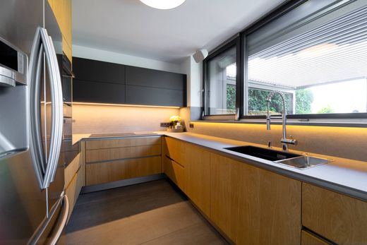 Arranged across three floors, the villa offers a seamless layout with an emphasis on functionality and privacy. The central living area, featuring a fireplace and large-format glazing, flows into a fully fitted kitchen equipped with Miele appliances. Direct access to the terrace with a swimming pool naturally extends the interior living space outdoors and strengthens the connection with the surrounding environment. Five comfortable bedrooms and four bathrooms reflect a consistent aesthetic - clean lines, premium materials, and a restrained palette that creates a harmonious setting for everyday living.