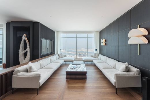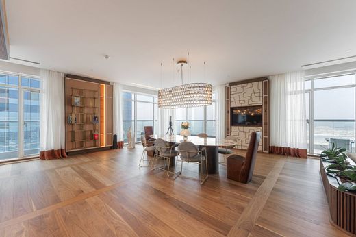 This substantial five-bedroom apartment on a higher floor of Emirates Crown, positioned within Dubai Marina's vibrant heart, has been entirely transformed with sophisticated contemporary interiors. Upon entry, a generously proportioned double living room unfolds, complemented by a formal dining area featuring a striking marble TV wall, alongside a sleek open-plan kitchen showcasing marble countertops and refined timber cabinetry. A separate wing houses a versatile media lounge with integrated study space, offering flexible options for intimate entertaining or quiet retreat. Pocket doors enable this zone to function independently or merge seamlessly with the main reception areas. The bedroom quarters occupy one wing of the apartment, with a secondary bedroom enjoying an advantageous corner aspect and sweeping dual views across the Marina. The principal suite presents a dramatic marble-clad bathroom complete with freestanding tub and twin vanities, plus an expansive dressing suite incorporating secure jewellery storage. Throughout, elegant wide-plank flooring harmonises with warm marble finishes, curated lighting installations, and premium appliances. Expansive glazing frames panoramic vistas towards Palm Jumeirah, whilst a generous balcony provides the perfect vantage point for evening views. Emirates Crown delivers comprehensive resident amenities: swimming pool, spa provisions including sauna and steam facilities, Jacuzzi, outdoor sporting areas, and beautifully maintained gardens. Occupying a coveted Marina address, the tower ensures effortless access to Dubai Marina Mall, diverse culinary destinations, and the adjacent JBR district. We invite you to arrange a private viewing of this exceptional apartment.