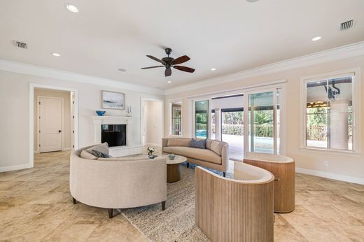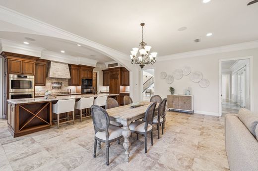 Positioned within a gated setting known for distinction and privacy, this custom-built Mediterranean-style estate offers a rare combination of architectural presence, thoughtful design, and extensive modern upgrades. Built in 2016 on a large private lot overlooking championship fairways, the residence spans approximately 6,438 heated and cooled square feet and delivers both scale and substance in equal measure. The two-story floor plan is intentionally designed for refined entertaining and comfortable everyday living. Formal living and dining rooms anchor the main level, complemented by a generous breakfast room and an inviting den. The gourmet kitchen serves as the heart of the home and is equipped with an impressive suite of Sub-Zero, Wolf, and Bosch appliances, a walk-in pantry, and abundant storage. Rich heartwood cabinetry, solid-surface flooring, and carefully selected architectural details create a timeless interior aesthetic throughout. The first-floor primary suite is a true retreat, featuring separate his-and-her bathrooms, expansive dual closets, and an attached private study. Additional guest accommodations are thoughtfully arranged, including a suite that also functions as a pool bath. An in-home elevator provides convenient access between levels, enhancing ease of living and long-term comfort. Upstairs, the home continues to impress with a dedicated home theater complete with risers and surround sound, along with a finished storage or flex space featuring custom wood shelving. Storage is a standout feature, with a reinforced attic accessible via a cargo lift from the spacious three-car garage, allowing for effortless organization without sacrificing living space. Recent improvements and upgrades further elevate the property and reflect meticulous ownership. Enhancements include a Sentricon termite prevention system, rust-prevention irrigation system, seamless gutters with gutter guards, a whole-house water softener, upgraded outdoor lighting at both the front and rear of the home, and a fully fenced backyard. The pool has been refreshed with a new pump and lighting, while a dedicated well supports lawn irrigation for lush, consistent landscaping. Additional upgrades include a whole-house generator, energy-efficient construction with open-cell foam insulation, multiple high-efficiency heat pumps with UV purification systems, and extensive surround sound throughout the home, including outdoor areas and the garage. Outdoor living is anchored by a heated pool and spa surrounded by beautifully landscaped grounds, offering privacy and a tranquil, park-like backdrop along the golf course. This exceptional residence pairs classic Mediterranean architecture with modern systems, abundant storage, and thoughtful enhancements, creating a home of enduring quality and understated luxury.