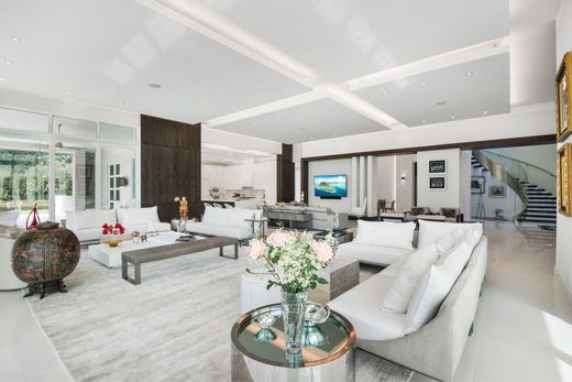 Rare opportunity in the prestigious, gated community of Le Rivage in Boca Raton. Set at the end of a private cul-de-sac, this 7-bedroom modern estate offers over 7,800 sq ft of living space on an oversized lakefront lot of more than half an acre, with water views wrapping around two sides of the home. The main level features an open-concept layout with soaring LED backlit ceilings, a chef's kitchen with Thermador and Miele appliances, custom cabinetry, quartz countertops, large island, and breakfast area. The great room's floor-to-ceiling pocket sliding doors showcase stunning lake and pool views, while a walk-in wet bar with wine refrigerator and formal dining room create an ideal entertaining setting. Also on the main level is a guest bedroom and an impressive primary suite with sitting area, dual spa-style baths, two custom walk-in closets, and a private office/TV room. Upstairs offers three en-suite bedrooms, a spacious loft with built-ins, and balcony access. A covered walkway leads to a 2-bedroom, 2-bath guest house above the garage. The air-conditioned, lift-ready 3-car garage is accessed separately via a covered walkway. Outdoor living features a resort-style pool with sun shelf and spa, expansive patio, full summer kitchen, and lush tropical landscaping overlooking the lake. Additional highlights include a whole-house generator, water filtration system, Crestron smart-home automation, and dedicated AV/mechanical room.