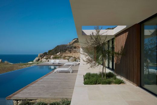 Positioned along the southern coast of Milos, Cavea is a striking example of minimalist design, commanding sweeping panoramic views over the Aegean Sea that extend to the distant silhouette of Crete.
