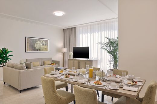 The apartment's three bedrooms appear to the left, all benefiting from built-in storage and en suite bathrooms. One of the guest bedrooms presents an elegant dressing room, while all three offer city views and access to an expansive terrace, with space enough for hosting al fresco dining when the weather permits. The terrace also presents exquisite views of the country's premier cultural and religious attraction, the esteemed Holy Mosque.