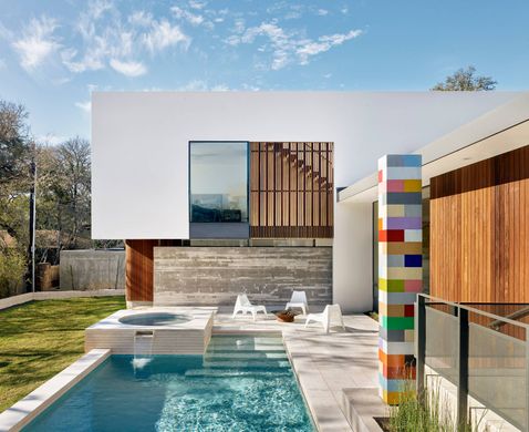 This Alterstudio masterpiece in Rollingwood exemplifies architectural excellence and thoughtful design. Enter a world where sophistication meets comfort through stunning living spaces framed by sleek paneled wood walls that create an effortless sense of flow and openness. The formal living area serves as the home's centerpiece, with floor-to-ceiling windows flooding the space with natural light while a dramatic concrete fireplace creates visual connection to the dining room beyond. This entertaining hub showcases sweeping views of the beautifully landscaped front yard, enriched by warm wood detailing throughout. The chef's kitchen centers around an expansive marble island with waterfall edges, ideal for casual meals and conversation. A custom banquet-style breakfast table elegantly divides the kitchen from the secondary living area—perfect for morning gatherings or evening drinks. When hosting larger affairs, the generously appointed butler's pantry offers duplicate appliances and ample storage to streamline any occasion. The primary suite provides a peaceful retreat with pool views and a spa-inspired bathroom featuring floating dual vanities, a freestanding soaking tub, and frameless glass shower. Direct courtyard access blends indoor refinement with outdoor serenity. Four additional bedrooms offer comfortable sanctuaries for family and guests, while a flexible game room and dedicated office provide space for play, productivity, and unwinding. Outside, the thoughtfully designed grounds include an alfresco dining area, sparkling pool and spa, level lawn, and outdoor shower—creating an ideal backdrop for relaxation and entertaining. Located moments from Austin's finest restaurants, outdoor recreation, entertainment, and shopping, this home delivers an exceptional lifestyle at the heart of it all. Experience modern living at its finest.