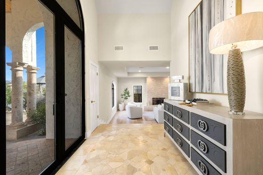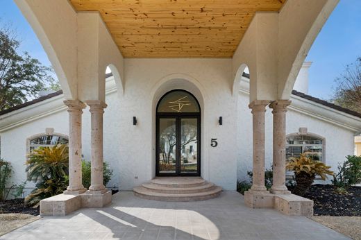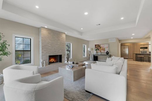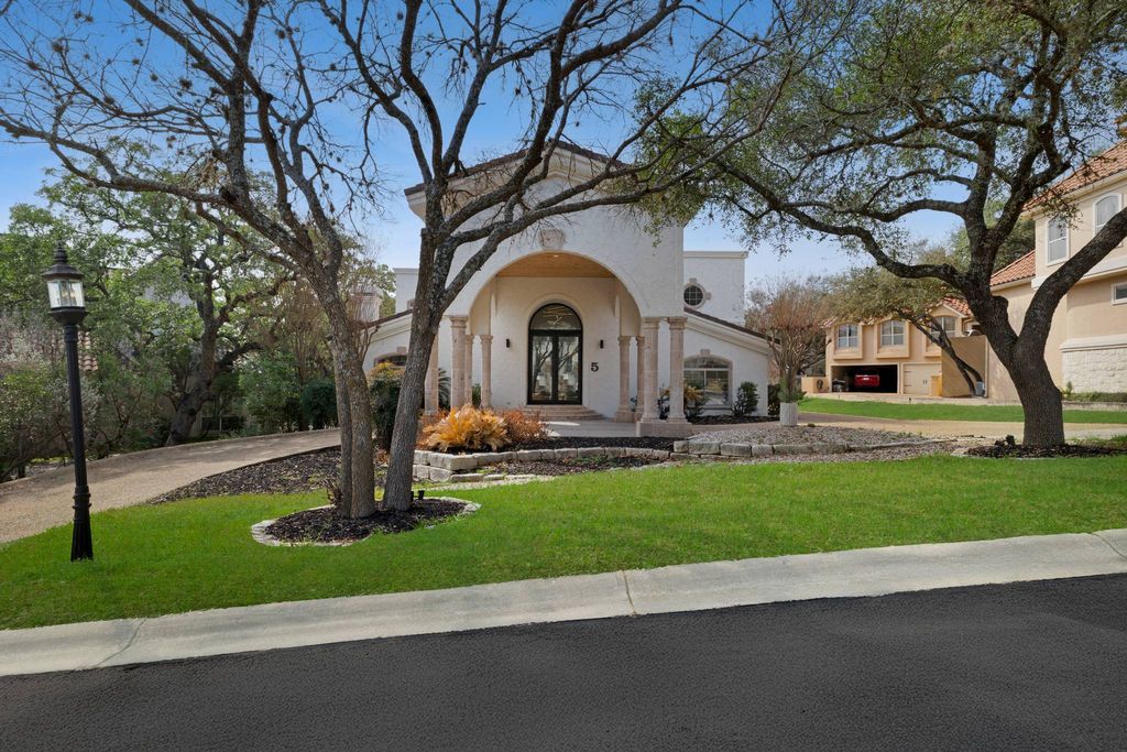 Renovated with a curated material palette, this Mediterranean residence is positioned on a tree lined cul de sac within The Dominion. The exterior presents balanced architectural proportions, while the interior reflects updated finishes and a structured layout. A custom double door entry opens to a two story foyer that establishes separation between formal and informal living areas. The primary living room features a fireplace and ceiling detail, providing a defined gathering space. The kitchen anchors the main level with an expansive island, built in appliances, gas cooking, side by side refrigeration, granite surfaces, and custom cabinetry. It connects directly to a secondary living area with a fireplace and wet bar, creating a functional layout for daily living and entertaining. The main floor includes a private study with built ins and an additional flex room suitable for an office, library, or studio. Upstairs, the primary suite includes dual walk in closets with custom organization and a bath with soaking tub, separate walk in shower, and dual vanities. Two secondary bedrooms complete the upper level, including one with a private bath. Additional features include a four car attached garage and natural gas service. Located within the guarded community of The Dominion, the home offers architectural character and updated interiors within an established setting.