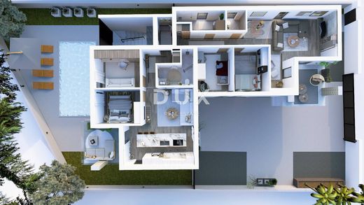 This exclusive penthouse covers the entire second floor of the building and offers supreme comfort and spaciousness. Situated in an attractive location, it is perfect for family life or an investment in a top-class property. The apartment consists of four spacious bedrooms, two elegant bathrooms and two open-space living rooms connected to the kitchen and dining room, providing the perfect balance of privacy and common space. The visualization shows 2 wings, one designed as a parental wing and the other as a children's wing. One room in the parental wing can be decorated as a home office. During the construction of the building, it is possible to separate the space into two separate apartments. All apartments will be decorated with parquet floors and first-class ceramics.