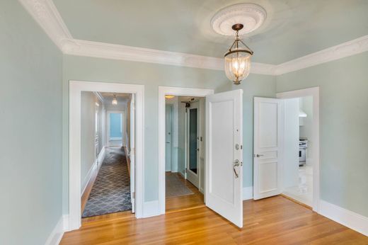 Full 7th floor Pacific Heights co-op in a free-standing building with City views on all 4 sides. Extensively remodeled by Brazilian craftsman with respect for its 1923 heritage. Hardwood floors, original moldings with egg and dart detail, and magnificent ceiling medallions. Grand living room with fireplace, formal dining room and custom kitchen with granite counters, breakfast bar and high-end appliances including gas range with pot filler. A continuous hallway encircles the center vestibule and foyer, with direct elevator access, connecting the public rooms with the 4 bedrooms and office. The primary suite looks out to iconic buildings, has tremendous wardrobe storage and a marble bath with heated floors. Other amenities: laundry room, service elevator with direct access, garage for 1 car, 2 deeded storage rooms, beautifully manicured common roof deck with superb views, resident manager, professional management, and main-level fitness room. Lafayette Park at the end of the block and a Walk Score of 98 putting shops and fine restaurants close by.