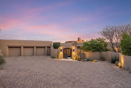 Golf Membership Available- Set atop a commanding hillside with sweeping views that stretch across the southern horizon, this extraordinary Desert Mountain residence, located in the Village of Saguaro Forest, blends contemporary pueblo design with remarkable circular architectural elements that evoke harmony, unity, and uninterrupted flow. Every room is thoughtfully oriented to capture majestic panoramas--dramatic mountain ranges, fiery sunsets, pristine Sonoran Desert terrain, and glittering night skies. Originally built by Platinum Homes and updates done by Cullum Homes, both award winning builders, the craftsmanship of the home is shown throughout. A long paver drive ascends to an expansive motor court ideal for generous guest parking. Beyond the gated front courtyard, a subtle yet striking entry welcomes you with a soothing water feature that sets the tone for the serenity within. Step into the magnificent great room, where walls of glass frame elevated vistas from every direction. The circular design is echoed throughout, including the great room and dining room's ceiling inset illuminated beam-and-plank detailing that effortlessly guides the eye back to the surrounding natural splendor and the seamless interior flow. The dream kitchen stands at the heart of the home--literally and figuratively--serving as the central hub from which all living spaces radiate. Adjacent lies a comfortable den with mounted TVs, a corner fireplace, and a built-in snack bar, perfect for anytime gatherings. A charming breakfast/game room with desk space, a comprehensive U-shaped wet bar, and an impressive 800-bottle wine cellar further elevate the home's entertainment appeal. Every space is intentionally crafted for connection, celebration, and everyday enjoyment. Step outside to a heavenly outdoor retreat designed for year-round living. A pool with patio-level entry, a raised spa, open-air grilling, and expansive circular living and dining patios create multiple areas to relax and entertain. The sunken fireplace with banco seating near the primary suite offers an unforgettable setting for stargazing against a backdrop of elevated desert vistas. Inside, a curved corridor leads to the palatial primary suite, a sanctuary behind double doors. This expansive retreat features a fireplace, private patio access, and a dramatic layout guiding you into a luxurious spa bath with dual vanities, separate water closets, a central walk-in shower, and a spacious soaking tub. Huge closet provides exceptional storage, while the private fitness room adds convenience and comfort. The outer corridor hosts four beautifully appointed ensuites, each designed for privacy and quiet indulgence with generous closets, luxurious baths, and enchanting views. One suite near the primary easily serves as a dedicated office with double-door entry and its own private front patio. A stunning powder room and a substantial U-shaped laundry center--complete with 2 stacked washer/dryer sets, abundant cabinetry, and extensive counter space--enhance the home's functionality. Meticulous craftsmanship and refined finishes are showcased throughout. Impeccably maintained and thoughtfully updated, this residence reflects genuine pride of ownership. Owned solar system with approximately 72 panels assists in keeping energy bills low compared to other homes of this size. The location in Desert Mountain is ideal with close proximity to the phenomenal amenities; 7 golf courses, 7 clubhouses, 8 restaurants, a world class fitness clubhouse and spa, 24 miles of private hiking trails bordering the Tonto National Forest and much more. Experience elevated desert living in a home that celebrates openness, inclusivity, and architectural artistry--all set against the captivating sweep of the southern horizon.