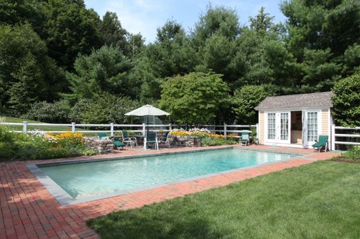 Beautifully restored and updated antique farmhouse with inground pool, cabana, guest house, tennis court and pond. Available to rent for July and August 2026. Scenic distant views frame this private 15-acre compound. Elegantly presented interiors, with extensive renovations supervised by an AIA architect specializing in historic preservation. Attention to detail and quality is evident throughout the home. The main level offers a warm and welcoming country kitchen/dining room with oversized island, high end appliances and finishes. There is also a charming living room, spacious family room (each with fireplace), a small office and a partially-screened wraparound porch. Four bedrooms and two Baths are offered on the upper level, including a wonderful primary bedroom suite with fireplace, full bath and dressing room. Additional accommodation is available in the detached guest house encompassing a living area, plus bedroom, kitchen and bath. Outside are patios, terraces, stunning gardens, stone walls and chickens (!) along with an inground gunite pool and hardcourt tennis court. Beyond the property's large private pond are the distant country views that help to create this most peaceful country setting. Available for the months of July and August at $20,000 per month or $36,000 for both months.