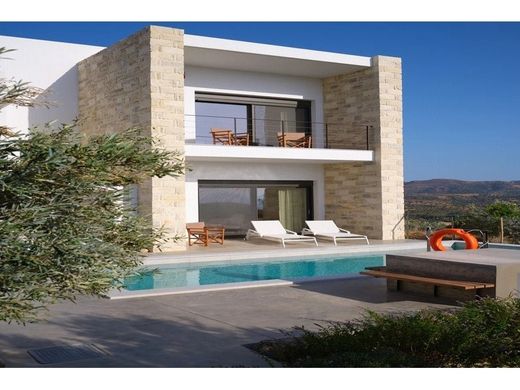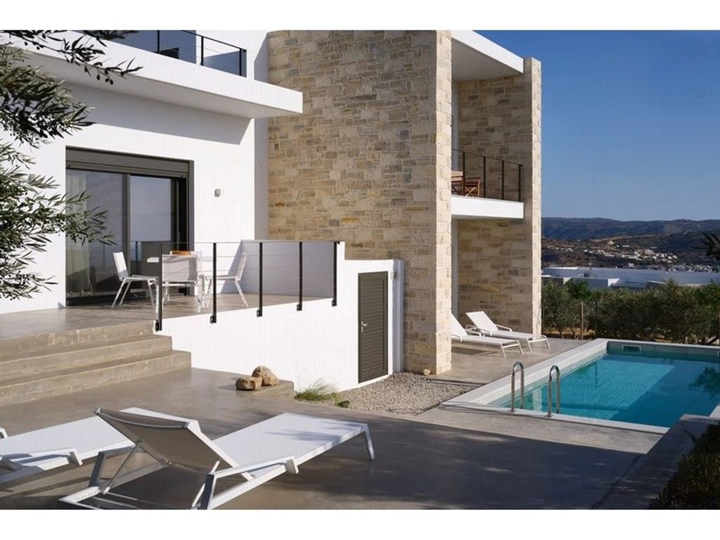 This is a spectacular villa for sale in Heraklion, Crete, located in the village of Kamilari, offering amazing views of the sea and the mountains. It has a total living space of 160m2 sitting on a 2000m2 plot, developed over 2 floors. It consists of 2 bedrooms and 2 bathrooms. There is a high quality open-plan kitchen, a living-dining area and a laundry room. On the same floor, there is a bathroom with a walk in shower and one bedroom with windows opening onto the swimming pool with beautiful views of the sea. Upstairs, there is a private floor with a bedroom and a large bathroom with a shower and balcony offering unobstructed views of the sea and the mountains. It is a modern construction with Photovoltaic Panels, a heat pump, floor heating and fan coils for cooling. Outside, the property features a landscaped garden and an olive grove. Additionally, there is a swimming pool and a sunbathing area where you can relax and enjoy amazing sea and sunset views. Features Barbecue Area Description Kamilari village is located in the south of Heraklion,in the Messara region. It is 67 km from Heraklion 2,5 km west of the archaeological sight of Phaistos and 2.5 km from the sea. Kamilari is built on the top of three hills and has about 340 permanent residents. It is a quiet, traditional village with panoramic views of the olive groves of the Messara plain. Important reminder.