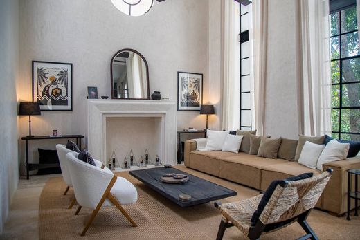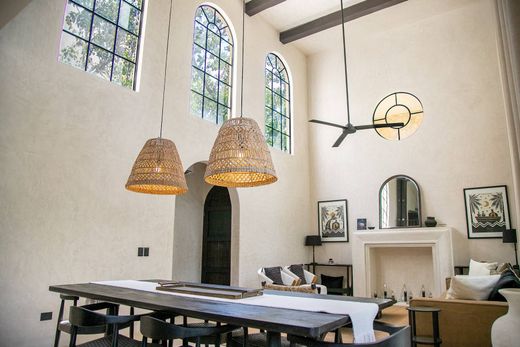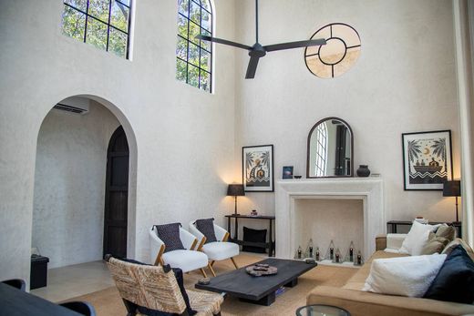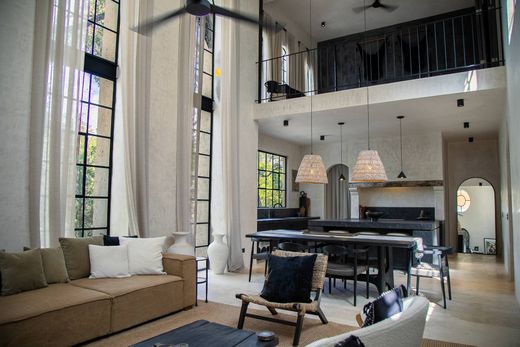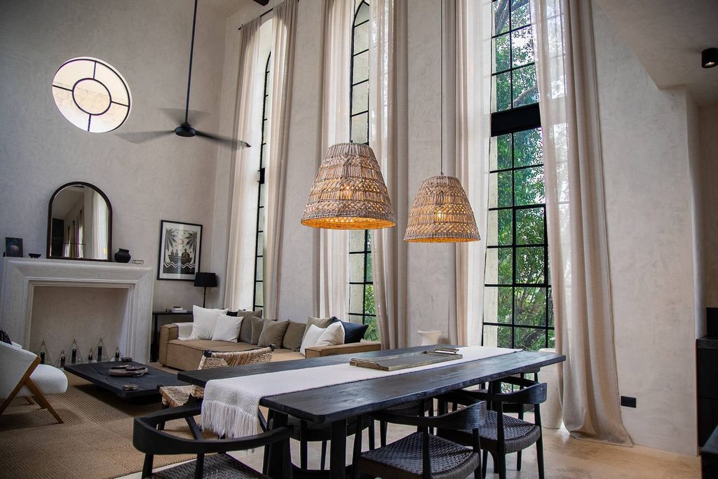Marble floors and a kitchen appointed with black granite countertops featuring a soft, leather-inspired finish reflect the strength and character of the materials. Its refined, contemporary design, defined by clean lines and an organic essence, is complemented by grand double-height ceilings that enhance the sense of space and natural light, creating an inviting and serene atmosphere throughout.