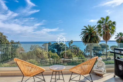 It comprises three bedrooms, two bathrooms, a spacious living room with dining area, and a large terrace of approximately 20 sqm offering panoramic views of the sea and the Lérins Islands.