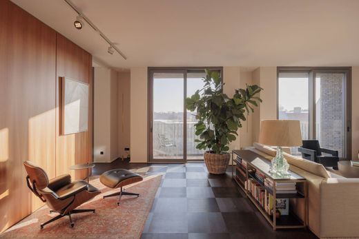 The spacious living and dining area forms the center of the home, with fluid transitions between the different zones. Large windows on both sides of the apartment provide exceptional natural light throughout the day and create a bright and open atmosphere. The custom-made kitchen with high-end appliances and a central island serves as the social heart of the space and integrates seamlessly into the overall architectural concept.