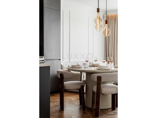 Inside, the apartment immediately conveys warmth and sophistication. Herringbone wooden flooring adds depth and character, while bespoke wall detailing and carefully selected materials create a timeless and harmonious aesthetic. The open-plan living space is designed for modern comfort, seamlessly connecting to the terrace through large sliding glass doors, allowing indoor and outdoor living to merge effortlessly.