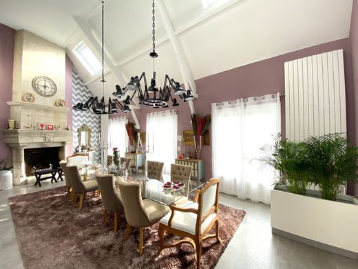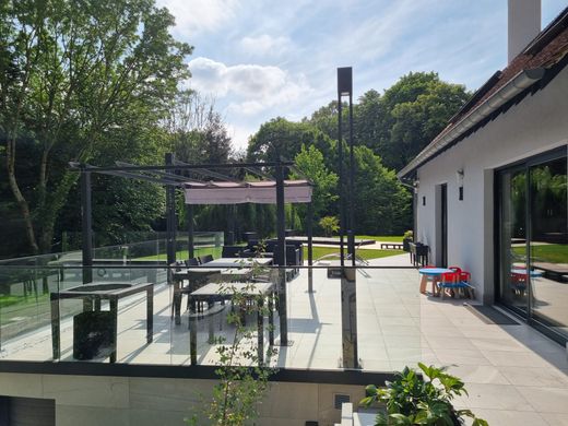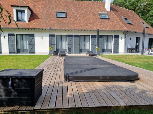 Magnificent property in a green setting, in the heart of a wooded park of 7500 m2, an American-style house of 365 m2 of living space with numerous services. It welcomes you with a large entrance with dressing room, a huge living room crossing cathedral with its monumental fireplace, and cozy lounge areas, opening on one level onto a south-facing terrace, with the heated swimming pool including jacuzzi and counter-current swimming. We continue the visit with a spacious dining kitchen of 40 m2 equipped with its island, it opens onto a covered terrace with BBQ, in addition its cellar is very practical, a suite and an office complete the ground floor. Upstairs a large master suite with cathedral volume, a bathroom with toilet and an adjoining dressing room, a mezzanine ideal for a games room and another suite with bathroom. A second entrance leads to a communicating house with living room, open-plan kitchen, and upstairs a large suite with bathroom and toilet; ideal for guests or a loved one. In the basement we also discover a gym with sauna and hammam, an equipped home cinema, a large cellar, a dressing room next to the laundry room and 2 large garages for 6 vehicles. In the annex, a greenhouse of 30 m2 with toilet and courtyard, 3 exterior cellars with a total area of 30 m2. Exceptional comfort for this haven of peace 30 minutes from Paris!